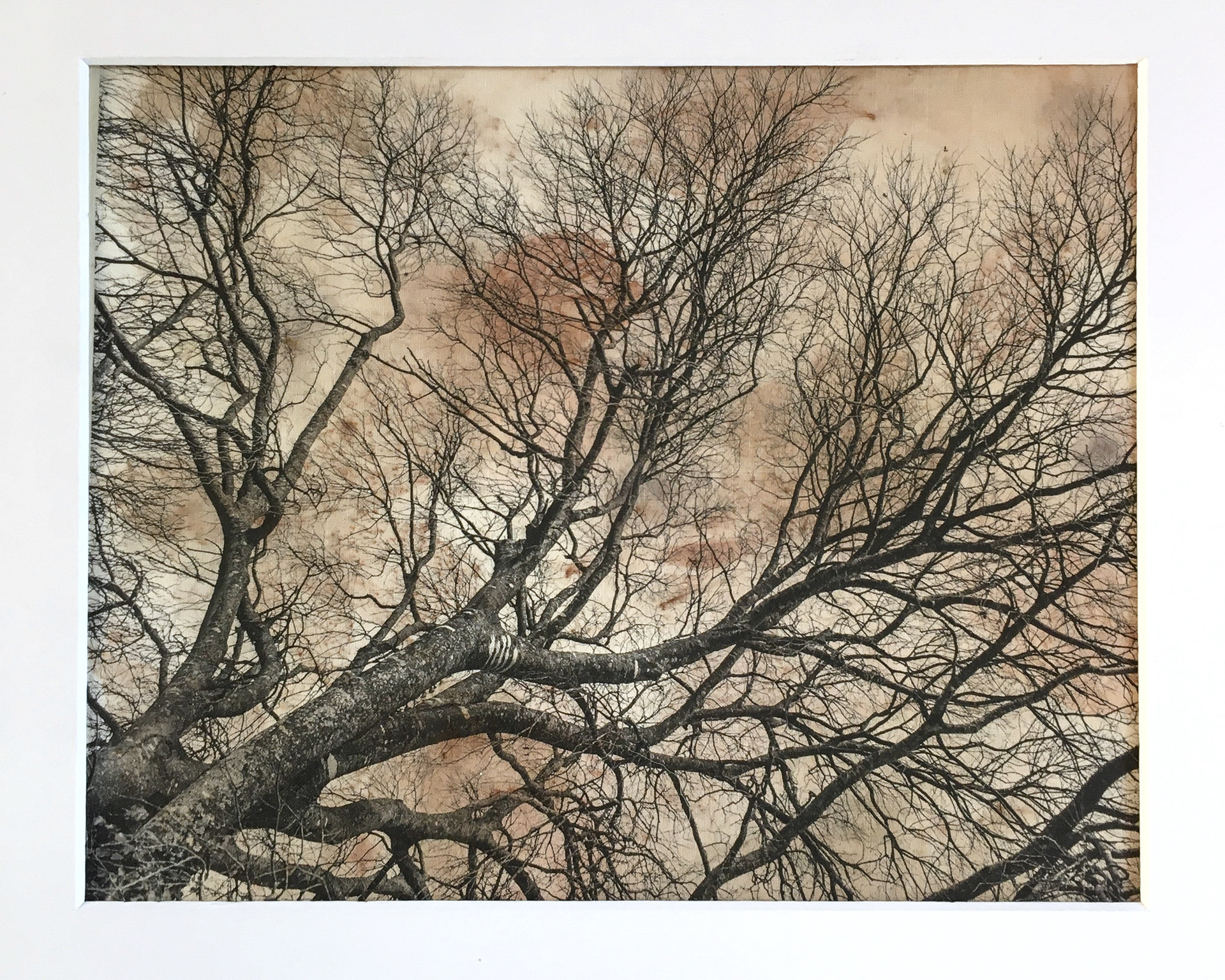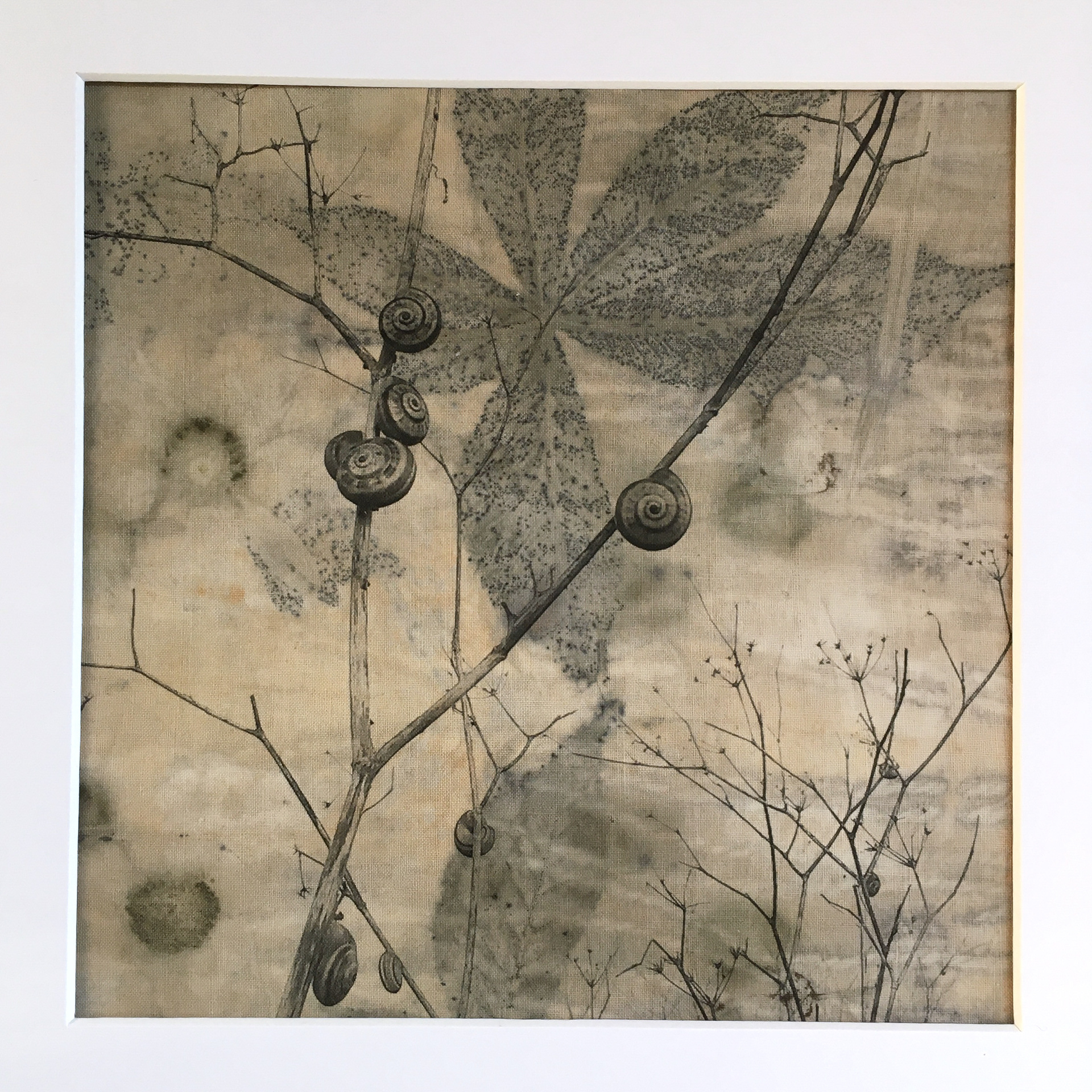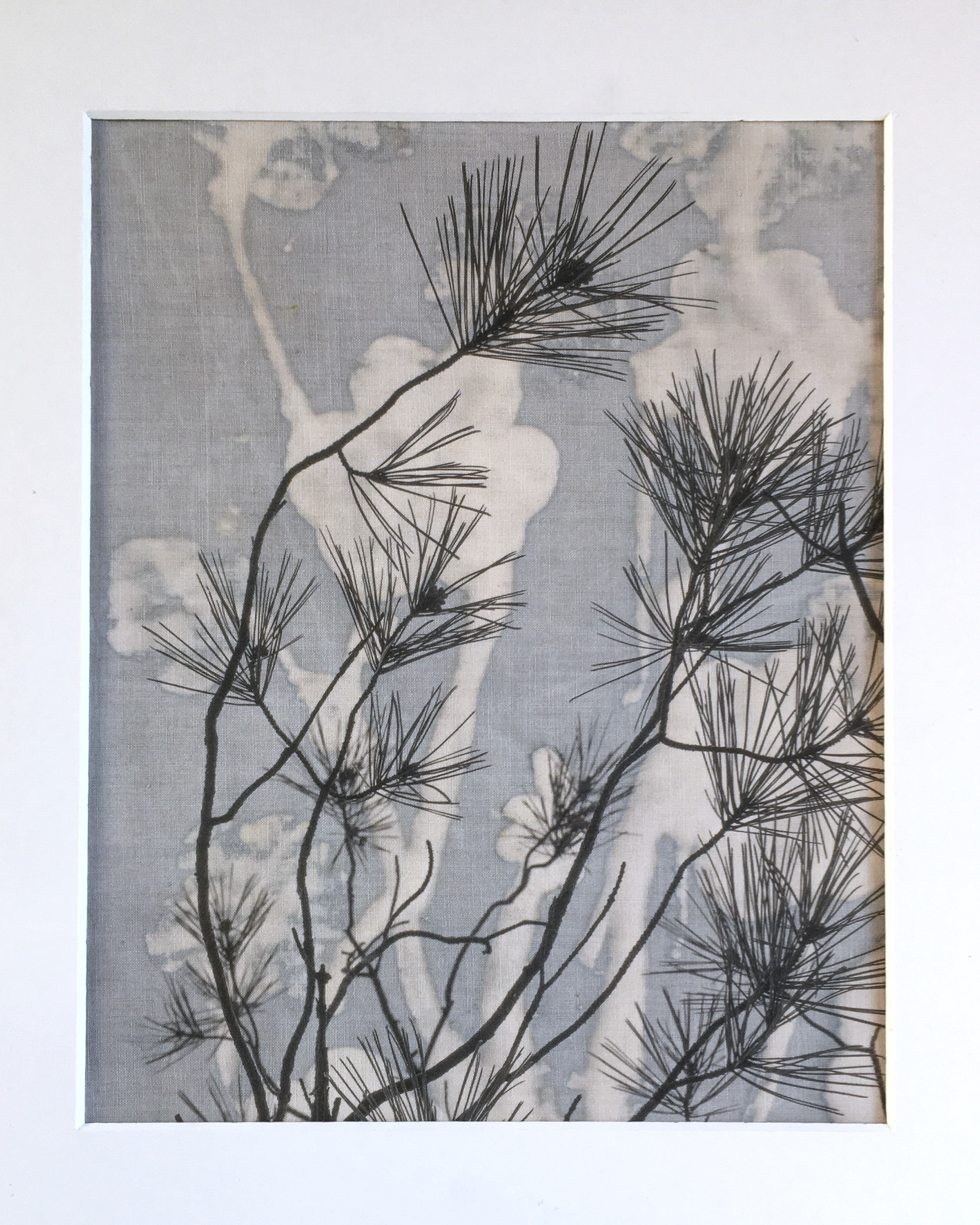 Inkjet printed photos on fabric hand printed with leaves, flowers and natural pigments.