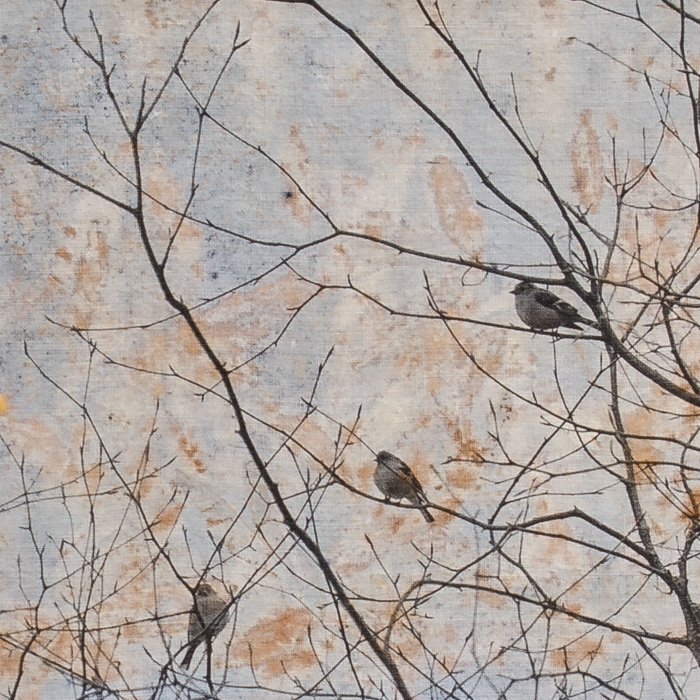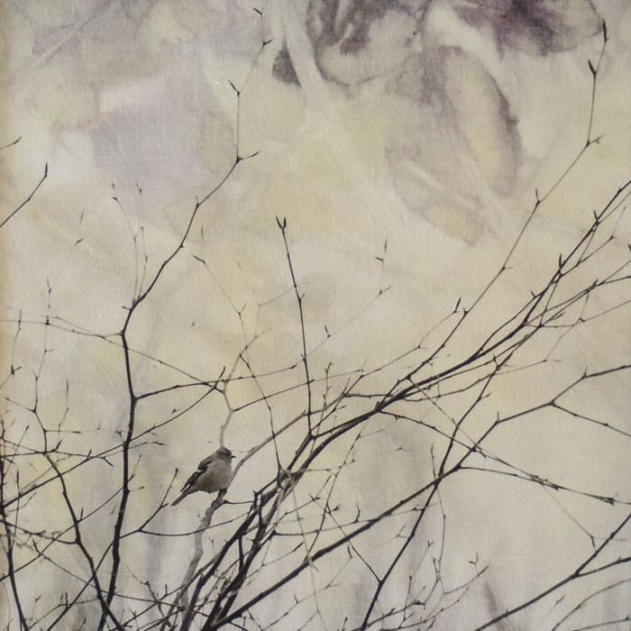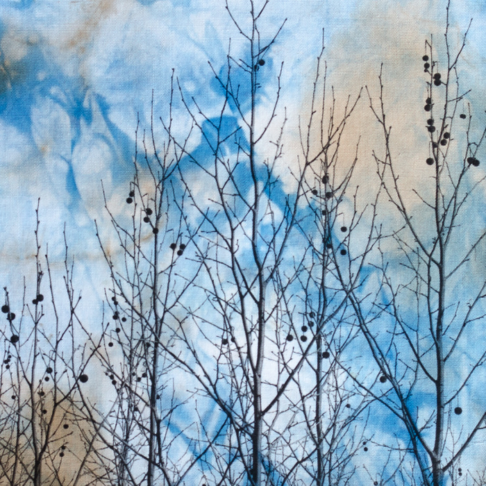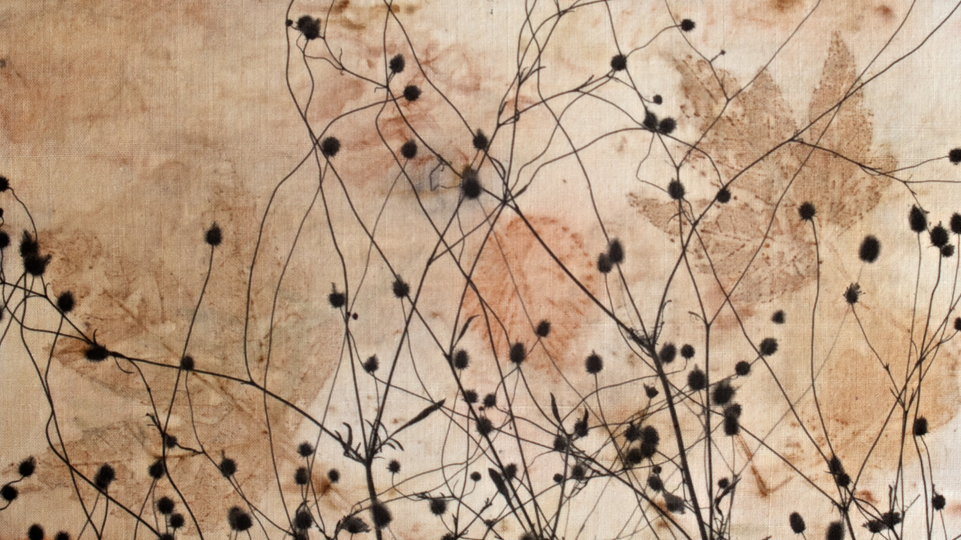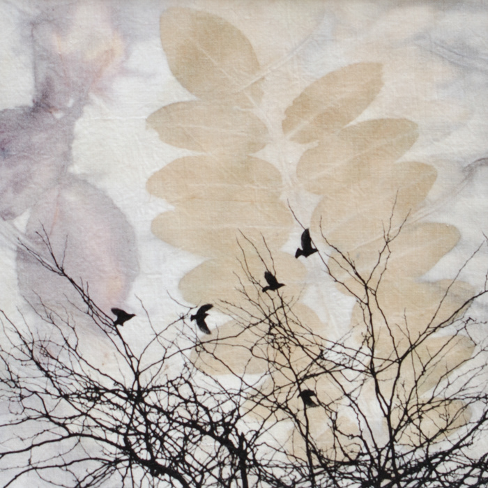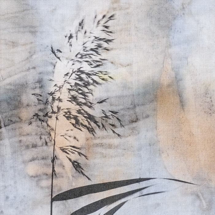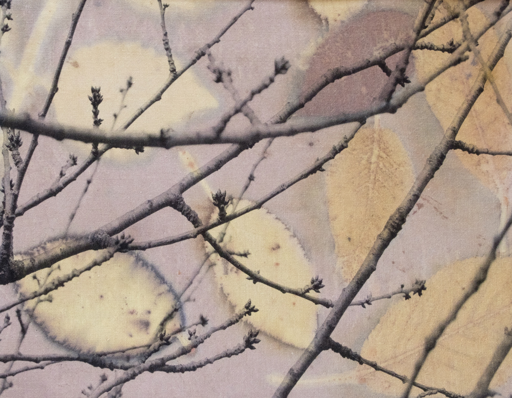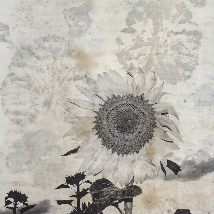Inkjet printed photos on fabric hand printed with leaves and flowers.